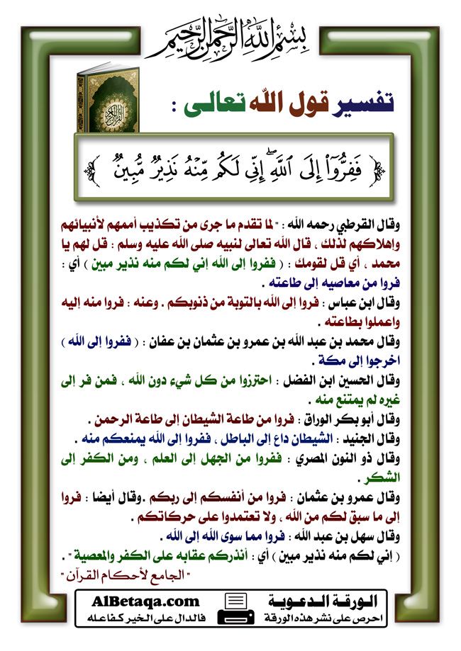 يقول الله تعالى: ﴿ فَفِرُّوا إِلَى اللَّهِ إِنِّي لَكُمْ مِنْهُ نَذِيرٌ مُبِينٌ ﴾ [الذاريات: 50]. |